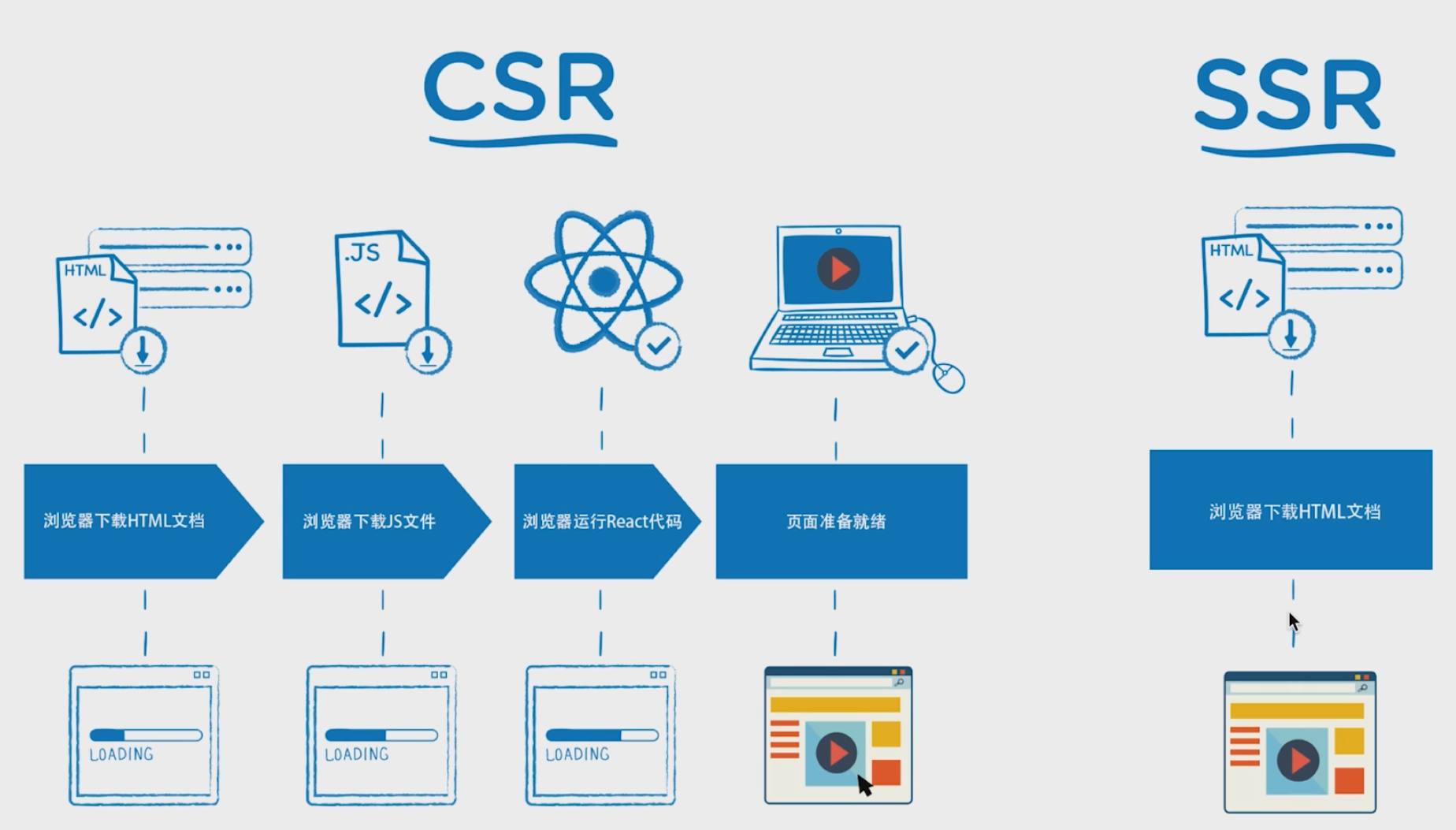 SSR执行流程:浏览器加载html文件 -> 服务端装填好内容 -> 返回浏览器渲染