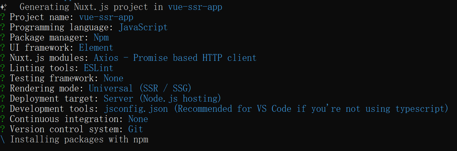 npm create nuxt-app <项目名>按照提示选择项目之后完成创建,需要注意,这一步要选择ssr